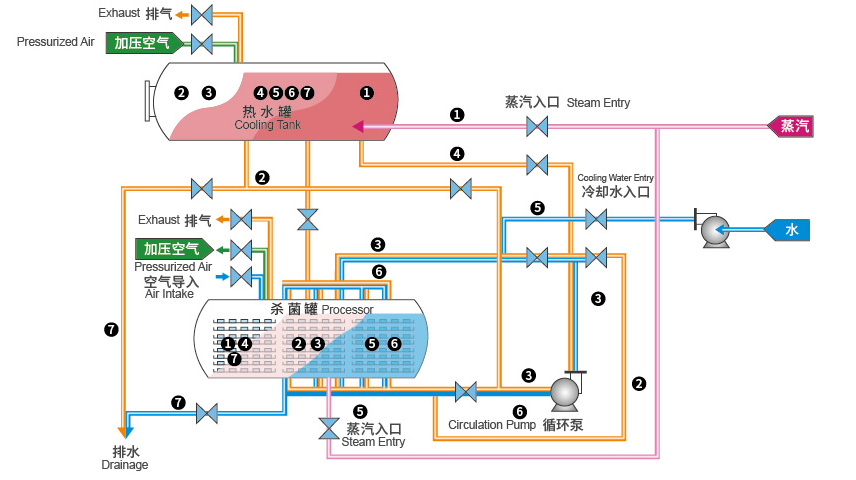 ? 殺菌結束后的熱水回收至上罐,節約蒸汽、能耗和殺菌時間。